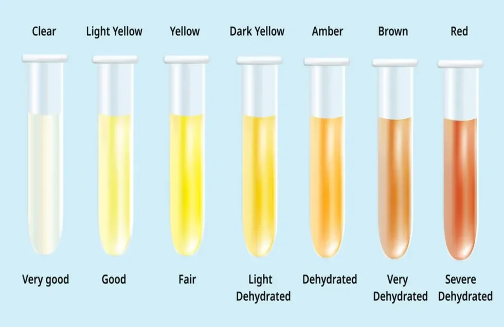 Μπορείτε να ελέγξετε τα επίπεδα υδάτωσης σας ελέγχοντας το χρώμα των ούρων σας. Για βέλτιστη υδάτωσης θα πρέπει να το χρώμα των ούρων σας να βρίσκεται ανάμεσα στο διαυγές (clear) μέχρι το σκούρο κίτρινο (dark yellow) όπως φάινεται δίπλα.